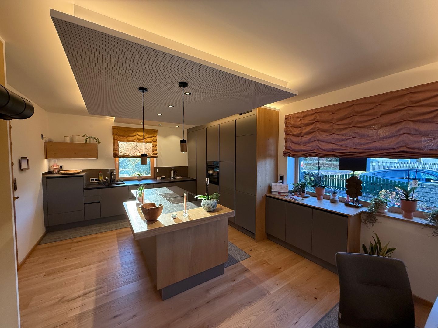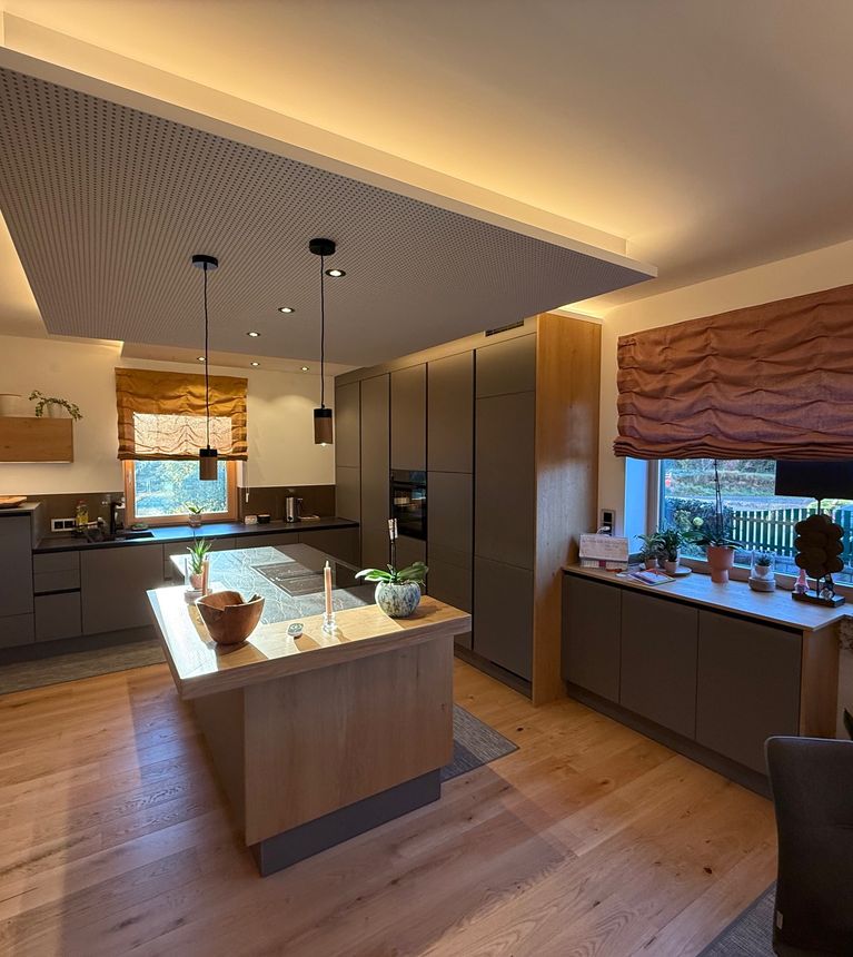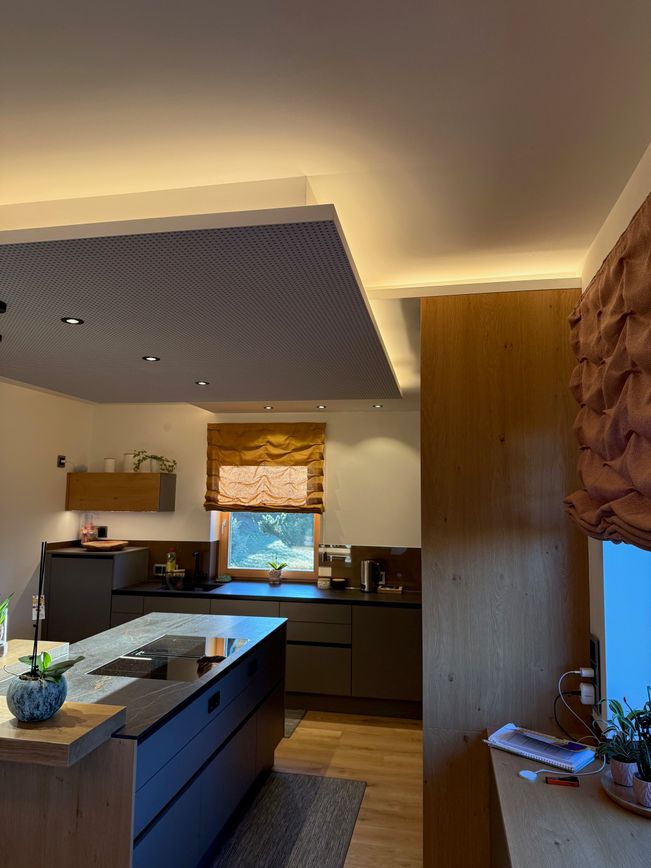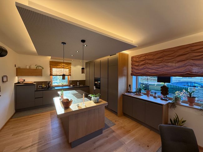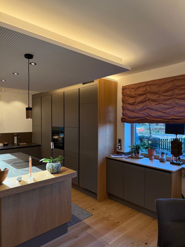 Edle, reduzierte Fronten treffen auf warme Holzelemente und durchdachte Lichtakzente, die dem Raum Tiefe und Behaglichkeit verleihen. Das individuell geplante Deckenelement sowie die abgestimmte Vorhanggestaltung runden das Gesamtbild harmonisch ab und sorgen für ein stimmiges Raumgefühl bis ins Detail.