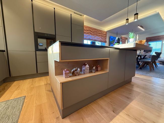 Edle, reduzierte Fronten treffen auf warme Holzelemente und durchdachte Lichtakzente, die dem Raum Tiefe und Behaglichkeit verleihen.