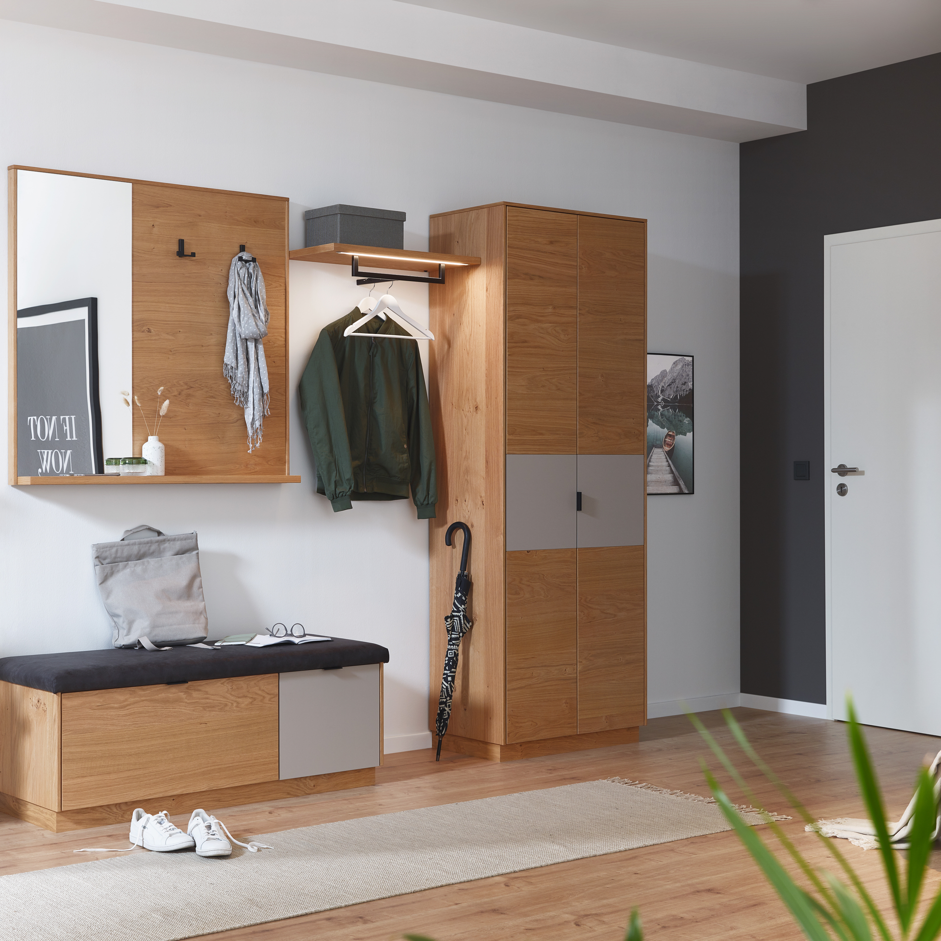 Als Visitenkarten für die eigenen 4 Wände vermittelt der Garderobenbereich den Designeinstieg in Ihre Wohnung. Außerdem bietet er Stauraum für alles, was man beim Kommen und Gehen so braucht. Von den Gummistiefeln bis zur Hutablage. Die Handtaschen, Mäntel, Mützen und viele weitere Accessoires nicht zu vergessen.